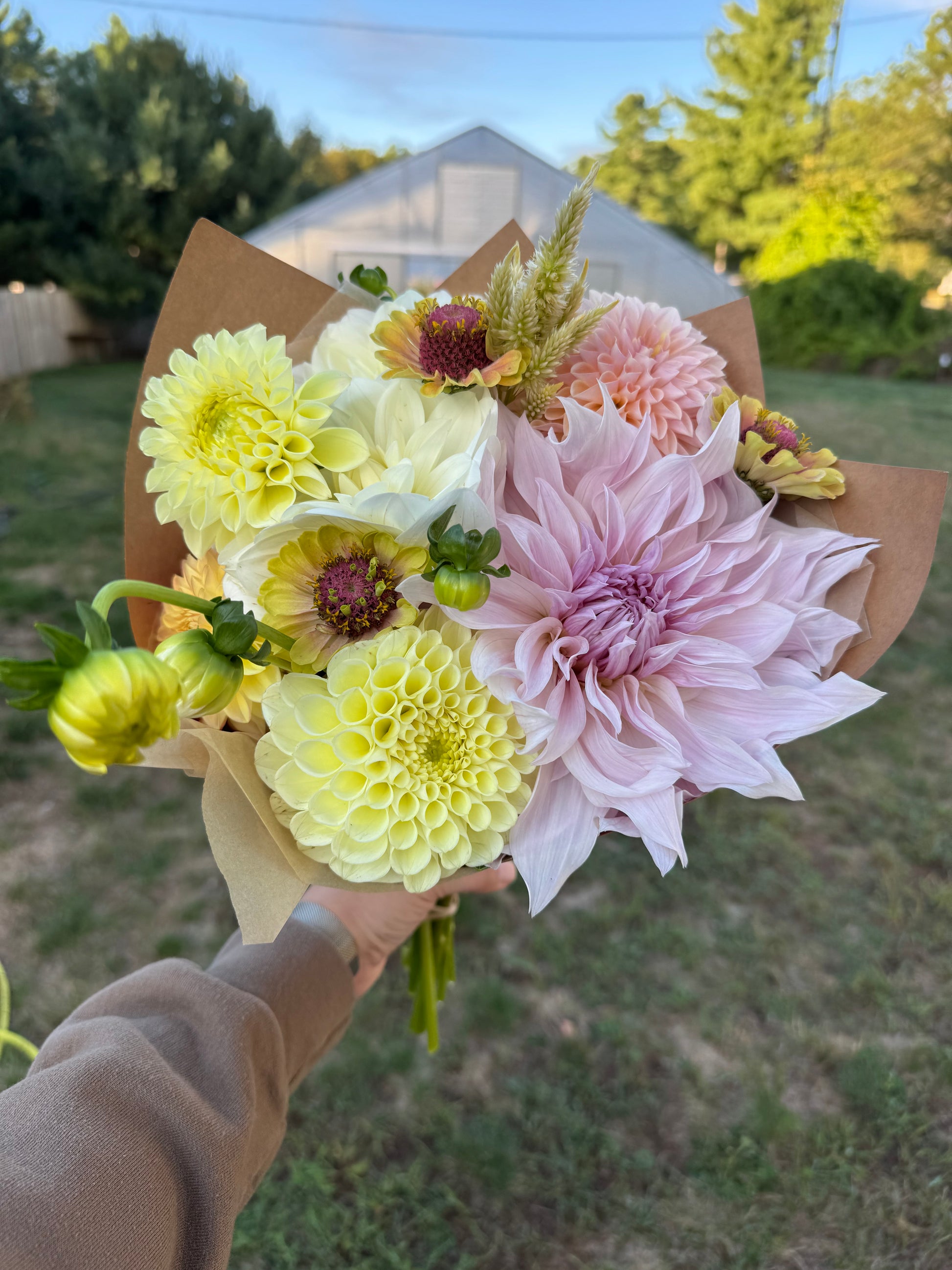 Each week, you’ll receive one of our kraft paper-wrapped dahlia focused bouquets, filled with the best of what’s growing that week. Dahlias are the flower that got me started on this flower farming journey. They sure are a lot of work and are only here for a short period of time but they are so worth all the effort. We grow over 100 different varieties of Dahlias on our property and each week your bouquets will feature a curated mix of all the fun colors and bloom varieties that we have available.